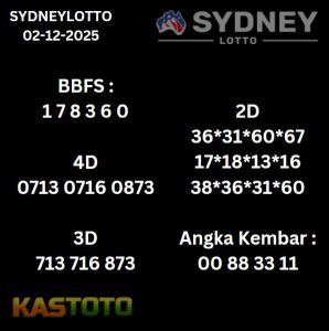 PREDIKSI TOGEL SYDNEY KASTOTO 02 DESEMBER 2025 Sydney telah menjadi permainan judi yang paling diminati di kalangan masyarakat Indonesia. Setiap harinya, ribuan pemain berusaha memprediksi angka-angka yang akan keluar sebagai pemenang pada pengundian berikutnya. Dengan munculnya platform online seperti Kastoto, akses ke permainan ini semakin mudah dan nyaman bagi para penggemar togel. Kastoto menjadi momen yang dinantikan oleh banyak pemain togel Sydney, termasuk yang bermain melalui platform Kastoto. Prediksi ini telah menjadi topik hangat di berbagai komunitas judi online, dengan para pemain berbagi informasi, strategi, dan pandangan mereka tentang kemungkinan nomor yang akan keluar.