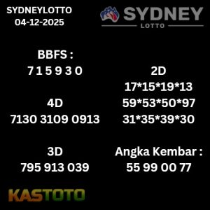 PREDIKSI TOGEL SYDNEY KASTOTO 04 DESEMBER 2025 Sydney telah menjadi permainan judi yang paling diminati di kalangan masyarakat Indonesia. Setiap harinya, ribuan pemain berusaha memprediksi angka-angka yang akan keluar sebagai pemenang pada pengundian berikutnya. Dengan munculnya platform online seperti Kastoto, akses ke permainan ini semakin mudah dan nyaman bagi para penggemar togel. Kastoto menjadi momen yang dinantikan oleh banyak pemain togel Sydney, termasuk yang bermain melalui platform Kastoto. Prediksi ini telah menjadi topik hangat di berbagai komunitas judi online, dengan para pemain berbagi informasi, strategi, dan pandangan mereka tentang kemungkinan nomor yang akan keluar.