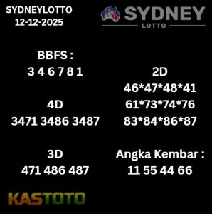PREDIKSI TOGEL SYDNEY KASTOTO 12 DESEMBER 2025 Sydney telah menjadi permainan judi yang paling diminati di kalangan masyarakat Indonesia. Setiap harinya, ribuan pemain berusaha memprediksi angka-angka yang akan keluar sebagai pemenang pada pengundian berikutnya. Dengan munculnya platform online seperti Kastoto, akses ke permainan ini semakin mudah dan nyaman bagi para penggemar togel. Kastoto menjadi momen yang dinantikan oleh banyak pemain togel Sydney, termasuk yang bermain melalui platform Kastoto. Prediksi ini telah menjadi topik hangat di berbagai komunitas judi online, dengan para pemain berbagi informasi, strategi, dan pandangan mereka tentang kemungkinan nomor yang akan keluar.