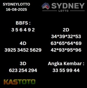 PREDIKSI TOGEL SYDNEY KASTOTO 16 AGUSTUS 2025 Sydney telah menjadi permainan judi yang paling diminati di kalangan masyarakat Indonesia. Setiap harinya, ribuan pemain berusaha memprediksi angka-angka yang akan keluar sebagai pemenang pada pengundian berikutnya. Dengan munculnya platform online seperti Kastoto, akses ke permainan ini semakin mudah dan nyaman bagi para penggemar togel. Kastoto menjadi momen yang dinantikan oleh banyak pemain togel Sydney, termasuk yang bermain melalui platform Kastoto. Prediksi ini telah menjadi topik hangat di berbagai komunitas judi online, dengan para pemain berbagi informasi, strategi, dan pandangan mereka tentang kemungkinan nomor yang akan keluar.