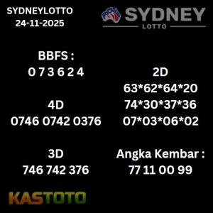 PREDIKSI TOGEL SYDNEY KASTOTO 24 NOVEMBER 2025 Sydney telah menjadi permainan judi yang paling diminati di kalangan masyarakat Indonesia. Setiap harinya, ribuan pemain berusaha memprediksi angka-angka yang akan keluar sebagai pemenang pada pengundian berikutnya. Dengan munculnya platform online seperti Kastoto, akses ke permainan ini semakin mudah dan nyaman bagi para penggemar togel. Kastoto menjadi momen yang dinantikan oleh banyak pemain togel Sydney, termasuk yang bermain melalui platform Kastoto. Prediksi ini telah menjadi topik hangat di berbagai komunitas judi online, dengan para pemain berbagi informasi, strategi, dan pandangan mereka tentang kemungkinan nomor yang akan keluar.