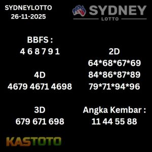 PREDIKSI TOGEL SYDNEY KASTOTO 26 NOVEMBER 2025 Sydney telah menjadi permainan judi yang paling diminati di kalangan masyarakat Indonesia. Setiap harinya, ribuan pemain berusaha memprediksi angka-angka yang akan keluar sebagai pemenang pada pengundian berikutnya. Dengan munculnya platform online seperti Kastoto, akses ke permainan ini semakin mudah dan nyaman bagi para penggemar togel. Kastoto menjadi momen yang dinantikan oleh banyak pemain togel Sydney, termasuk yang bermain melalui platform Kastoto. Prediksi ini telah menjadi topik hangat di berbagai komunitas judi online, dengan para pemain berbagi informasi, strategi, dan pandangan mereka tentang kemungkinan nomor yang akan keluar.